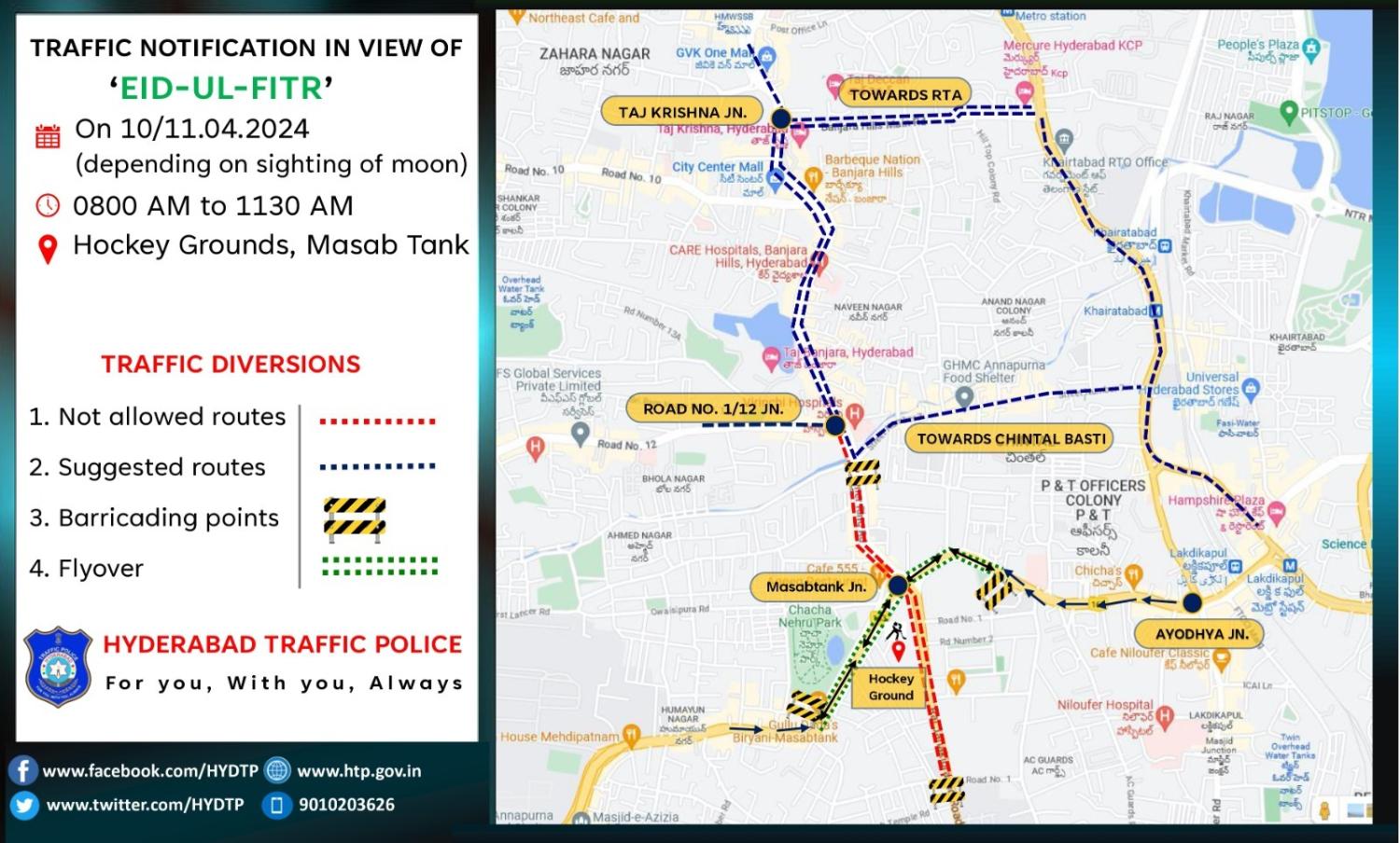 For the prayers to be held at the hockey ground in Masab Tank, traffic from Mehdipatnam and Lakdikapul towards Banjara Hills would be diverted through Sant Nirankari Bhavan, Khairatabad RTA Office and Taj Krishna Hotel. Traffic from Banjara Hills Road No. 12 will be diverted towards RTA Khairatabad