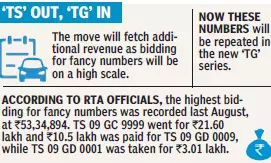 This move will fetch additional revenue as bidding for fancy numbers will be on a high scale. According to RTA officials, the highest bidding for fancy numbers was recorded last August, at Rs 53,34,894. TS 09 GC 9999 went for Rs 21.60 lakh and Rs 10.5 lakh was paid for TS 09 GD 0009, while TS 09 GD 0001 was taken for Rs 3.01 lakh.