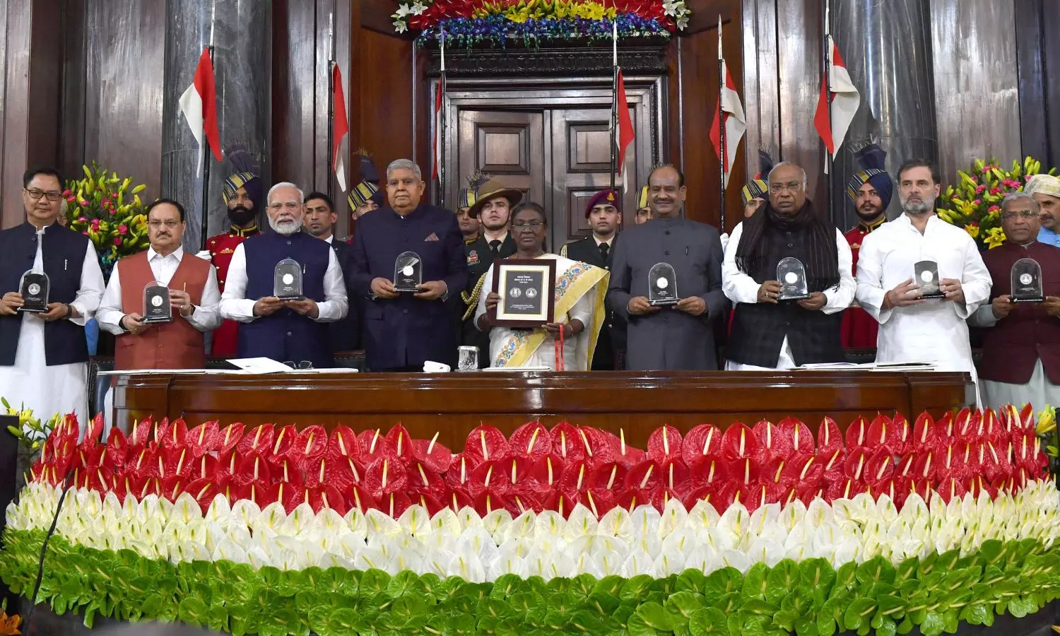 The event was attended by Vice-President Jagdeep Dhankhar, Prime Minister Narendra Modi, Lok Sabha Speaker Om Birla, Leaders of the Opposition and the members of Parliament.
