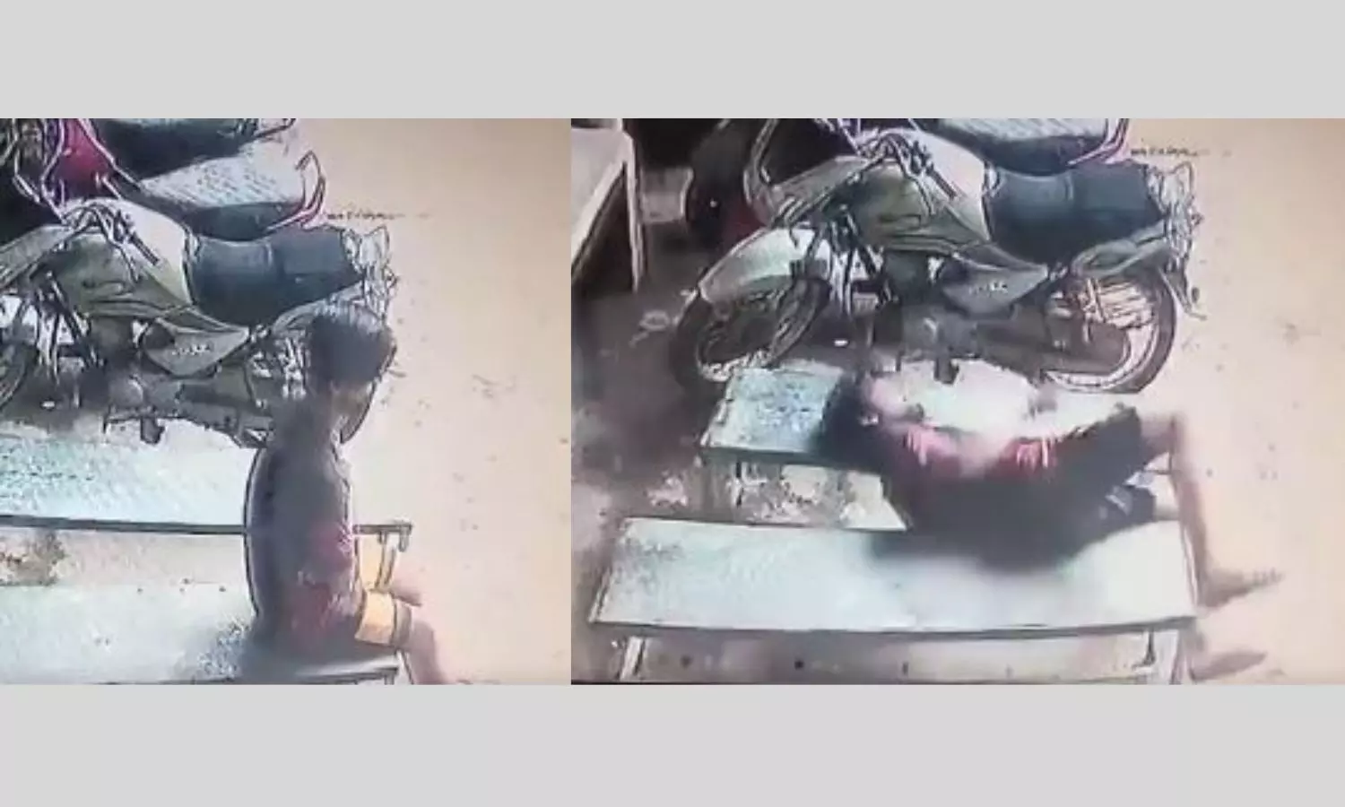 In the footage, the person can be seen sitting on a bench, then abruptly passes out and falls to his left. His body falls to the floor and his head hits another bench next to him.