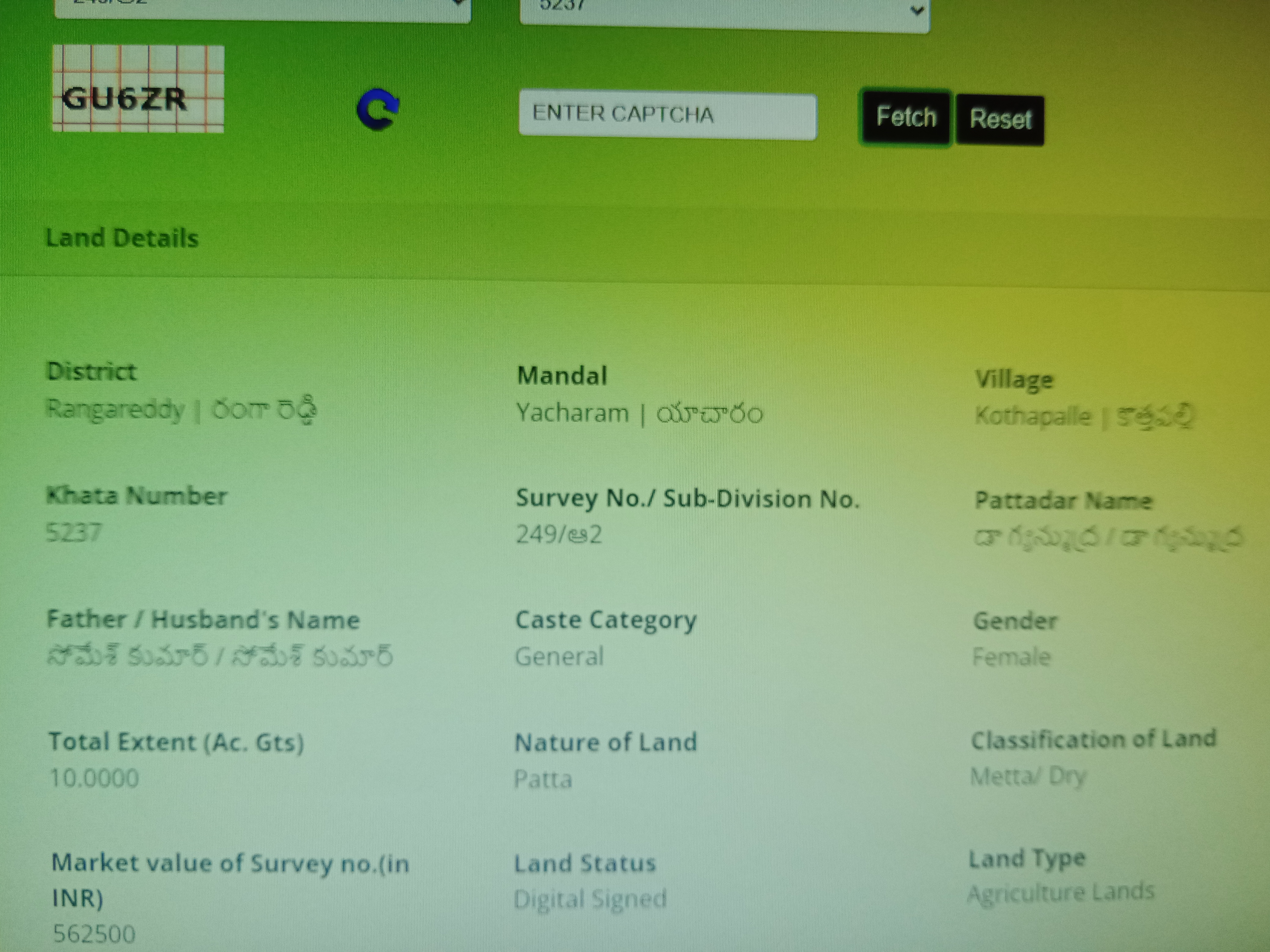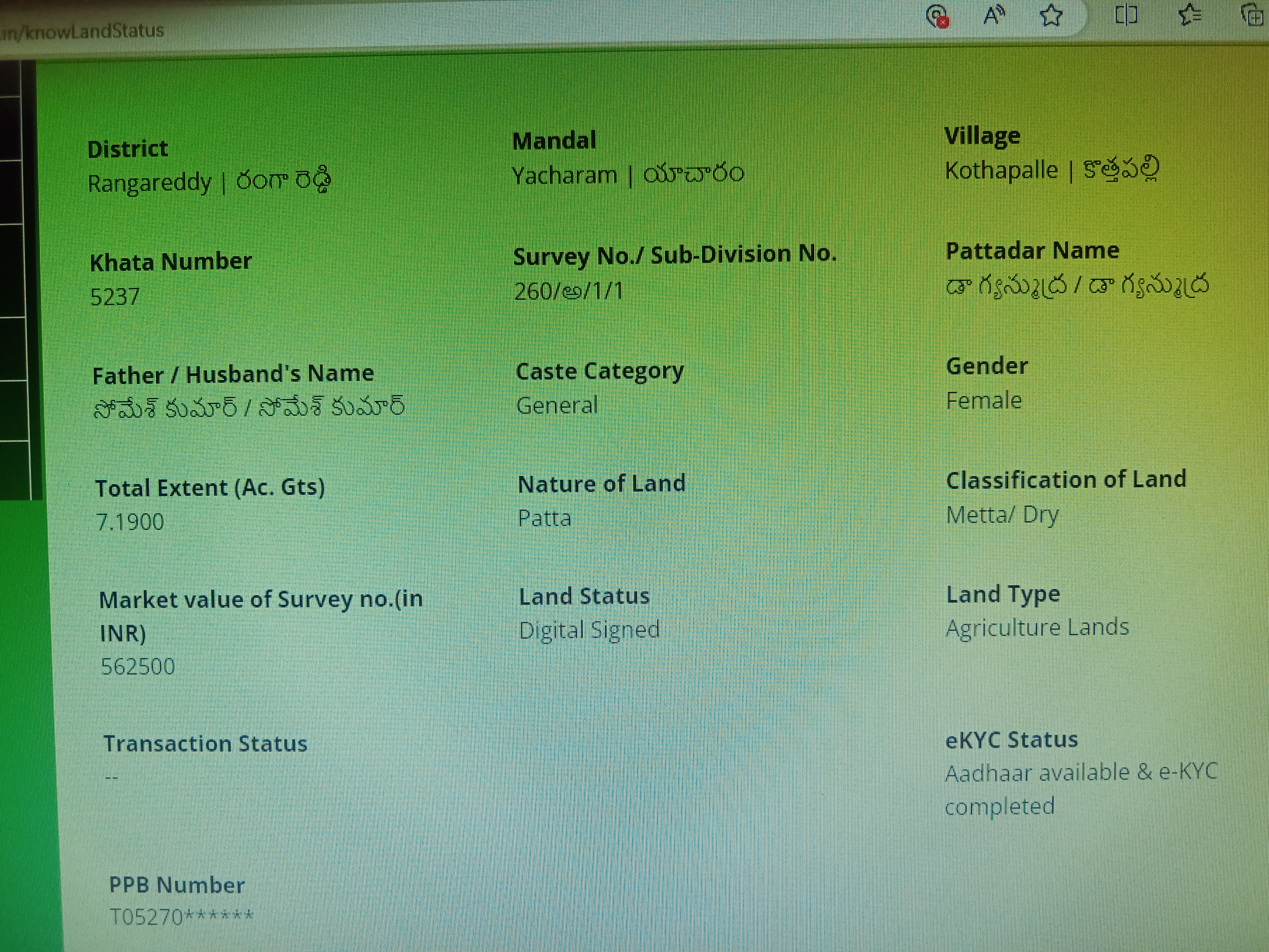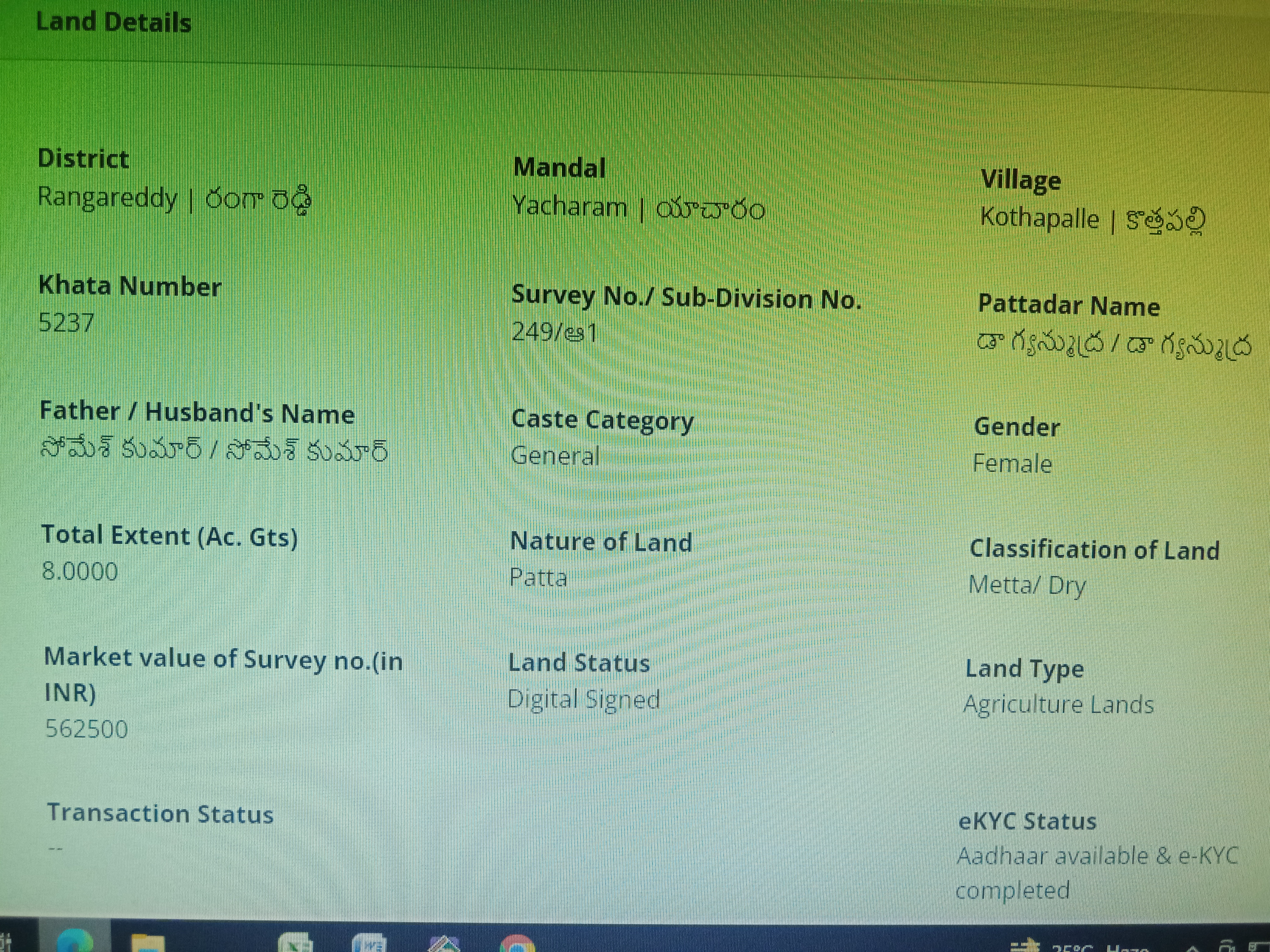 According to Dharani portal, at least 25 acres of agriculture land in Survey No.s 249, 249/2, and 260 in Kothapalli village of Yacharam mandal in Rangareddy district are registered in the name of Dr Gyan Mudra. This property has a khata number and the portal mentions it as patta land.