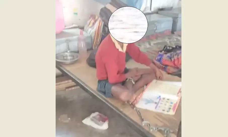 Photograph: A screengrab from a video shows the Class IV boy chained in his school hostel.
