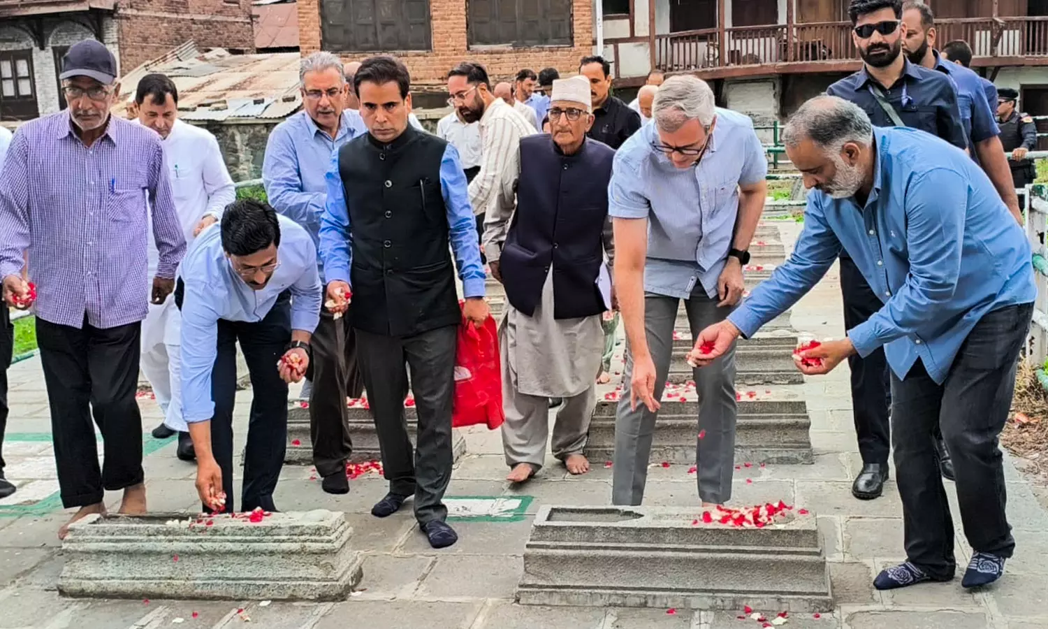 Abdullah who was accompanied by several National Conference (NC) colleagues including ministers and lawmakers and subsequently joined by his father and party president Farooq Abdullah quietly drove to Khawaja Bazaar quarter of Kashmiri capital to recite Fatiha, the Islamic supplication for mercy and forgiveness for the departed, an offer floral tribute.