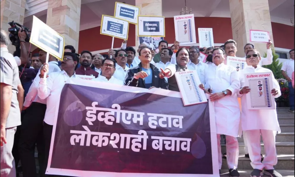 Nagpur: Opposition members staged a demonstration on the steps of the Maharashtra Vidhan Bhawan here on Monday and raised slogans against the use of EVMs in elections.
