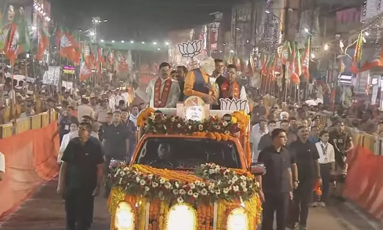 People, gathered on both sides of the route of the 1.5 km-long roadshow, were seen greeting him by raising slogans ‘Modi, Modi’, even as the PM reciprocated their gestures by waving the symbol of Lotus, BJP party’s symbol, at them.