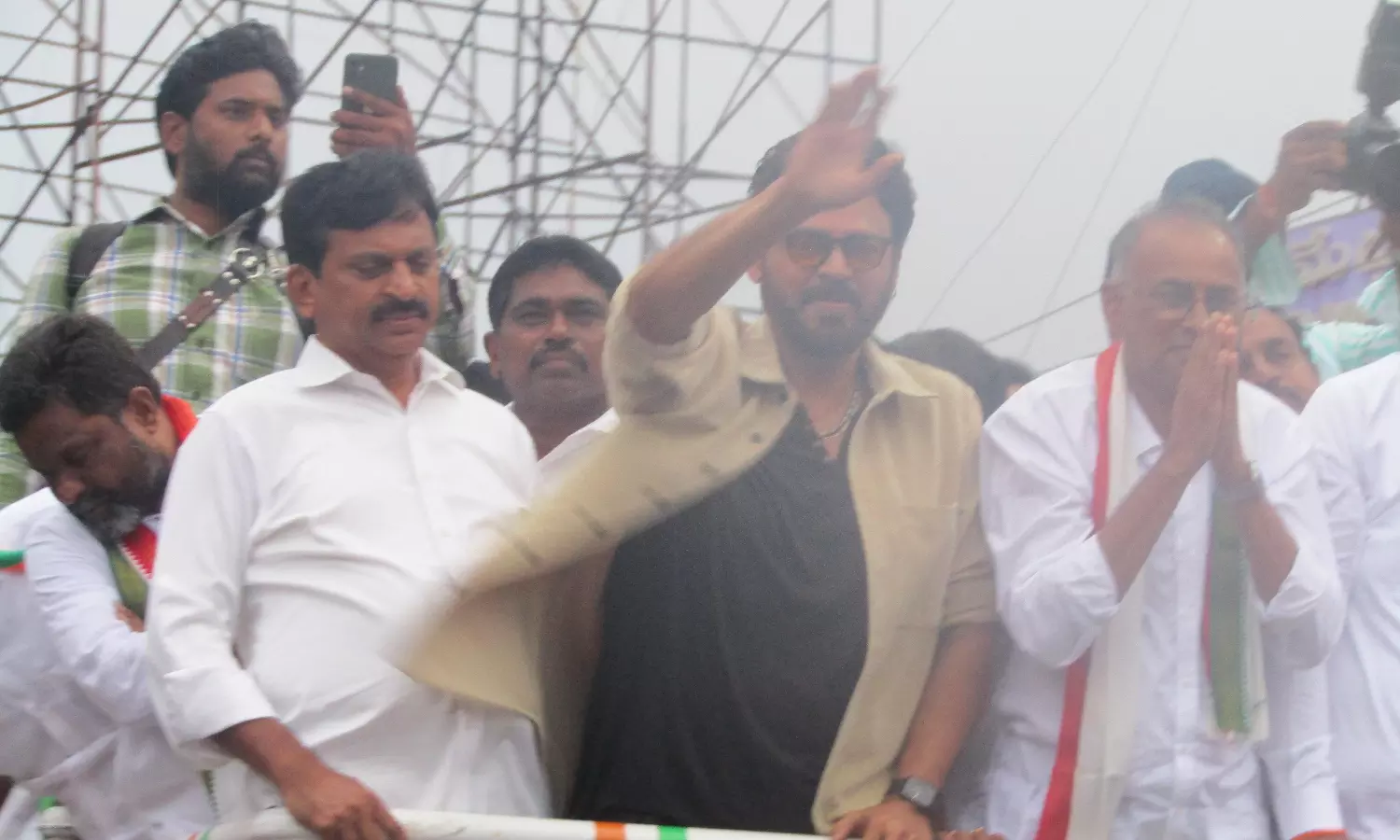 Khammam: Cine actor Daggubati Venkatesh on Tuesday participated in a 3-km-long road show in Khammam in support of Congress candidate Ramashayam Raghuram Reddy. People lined the route and stood on the top of buildings to see him.