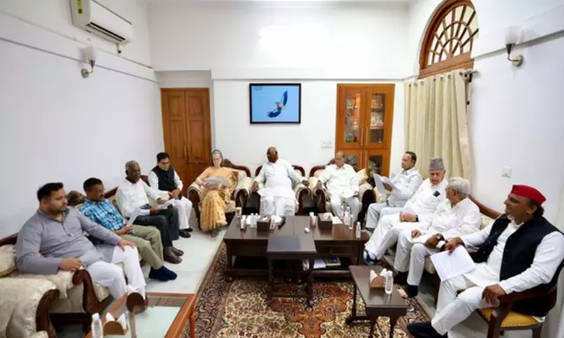 Leaders from Congress, Samajwadi Party, CPI-M, CPI, DMK, JMM, AAP, RJD, Shiv Sena (UBT), and NCP (Sharad Pawar) gathered at Congress president Mallikarjun Kharge's residence for discussions as the final phase of polling is underway.