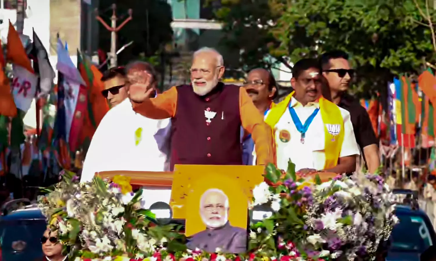 Modi commenced his roadshow in the city ahead of April 9 elections to the territorial Assembly.