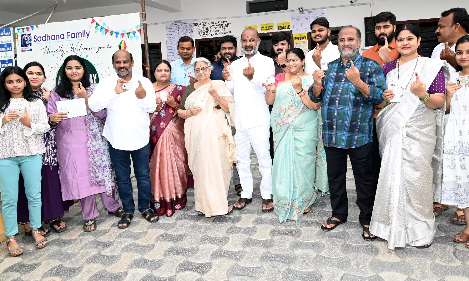 BJP candidate Bandi Sanjay Kumar exercised his franchise at Jyothi Nagar and Congress candidate Velichala Rajendar along with his family members cast their votes at a polling station in the Christian colony. BRS party candidate B Vinod Kumar along with his family members voted at the Urdu Medium High School in Mukurumpura colony in Karimnagar city.