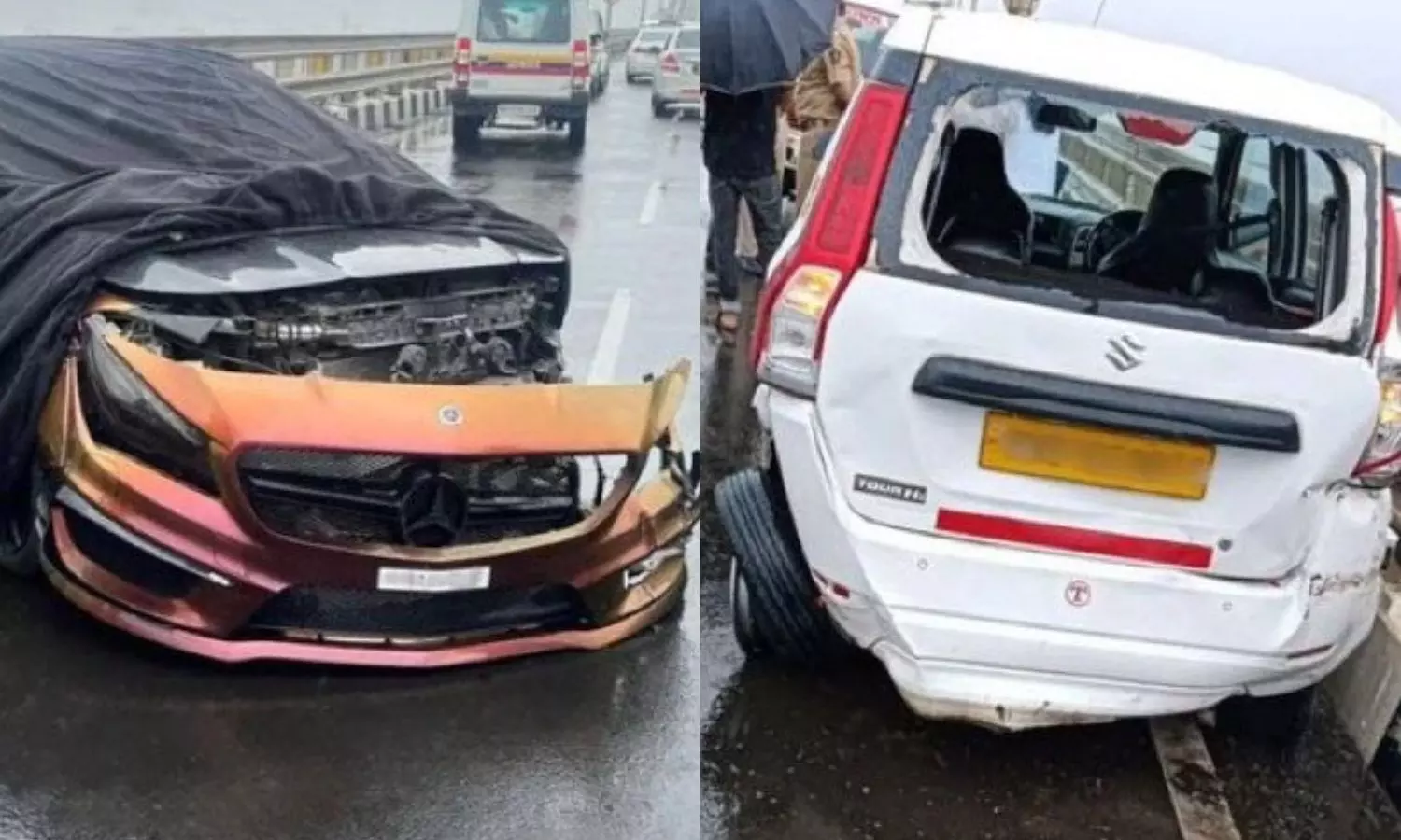 The videos of the incident that are now viral on social media platforms show the Mercedes with a damaged bonnet and the BMW with a broken rear bumper, while the Wagon R the worse hit with all windows broken, bent rims and tyres popped out.