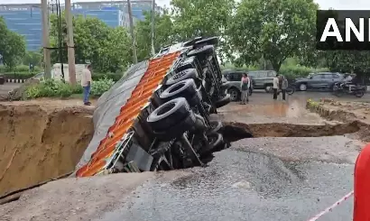 Truck Carrying Liquor Falls into Crater After Road Collapses in Rain-Hit Gurugram