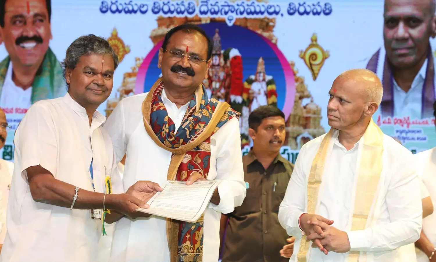 Participating in the house title distribution programme organised at the Mahati Auditorium in Tirupati, TTD chairman Bhumana Karunakar Reddy, along with executive officer A.V. Dharma Reddy, handed over the pattas to the beneficiary employees and retired personnel.