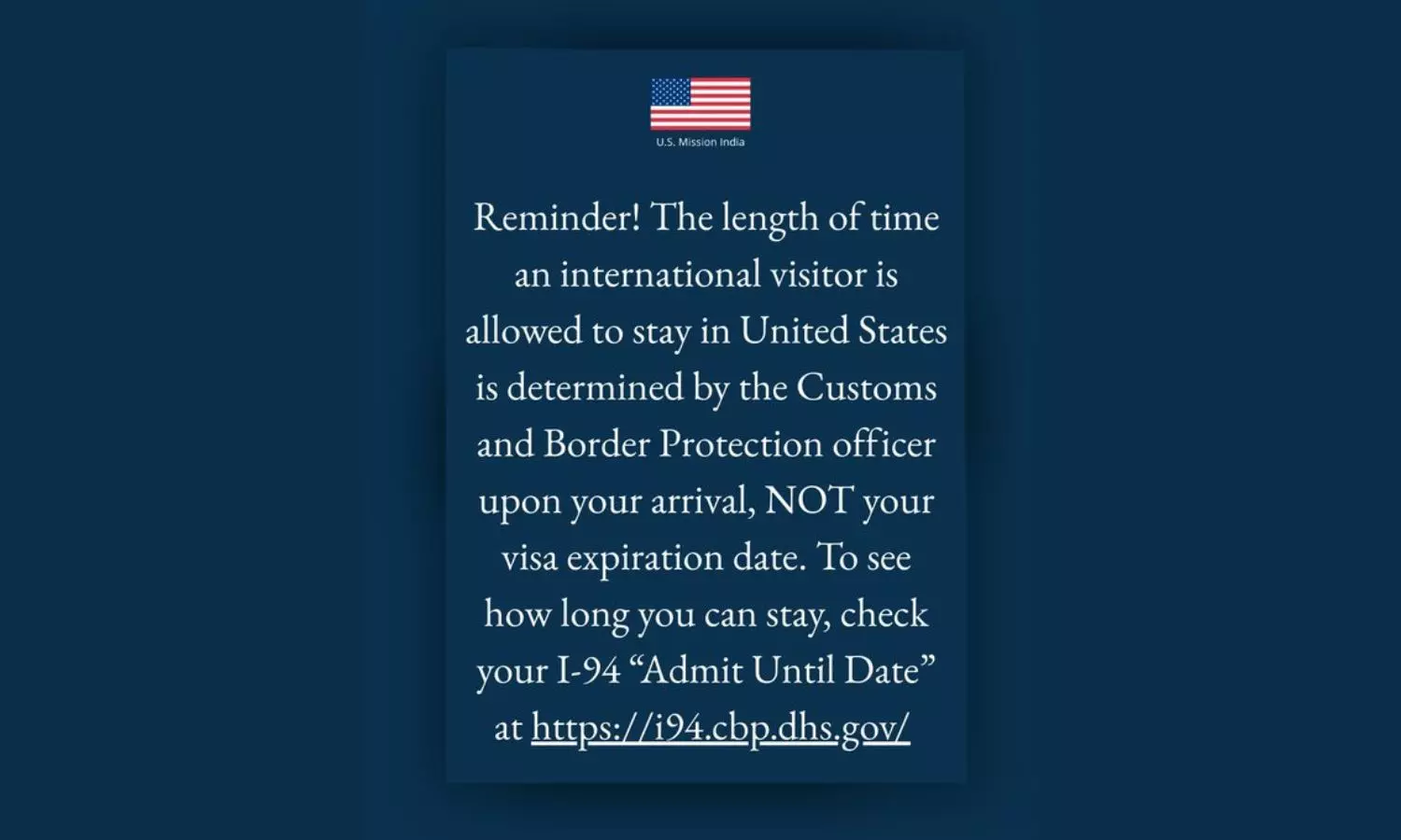 The embassy further clarified that those who want to know how long they are allowed to stay in the US can check their I-94 Admit Until Date at https://i94.cbp.dhs.gov.