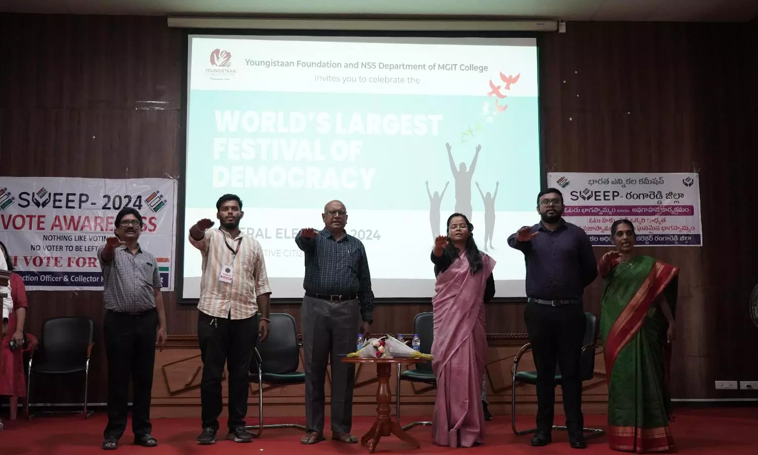Youngistaan Foundation, in collaboration with the National Service Scheme (NSS) of MGIT, organized a town hall event titled "World’s Largest Festival Of Democracy" aimed at discussing the pivotal role of youth in elections and voting through various art forms and discussions.