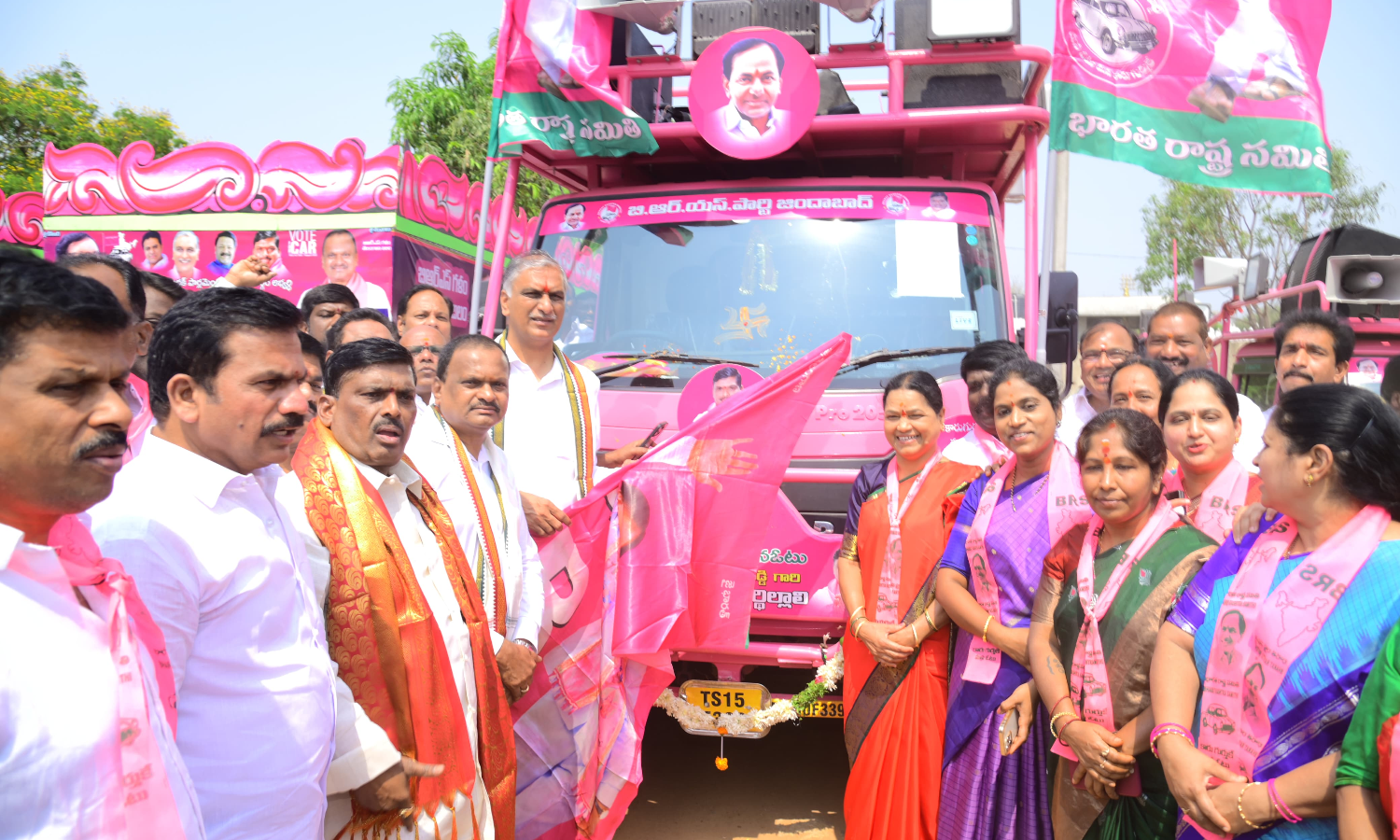 Following the BRS launching its campaign vehicles from the temple on April 10, the Congress on Friday flagged off its fleet in support of party candidate Neelam Madhu Mudiraj, who is pitted against BRS’ P. Venkatrami Reddy, and BJP’s M. Raghunandan Rao in Medak constituency.