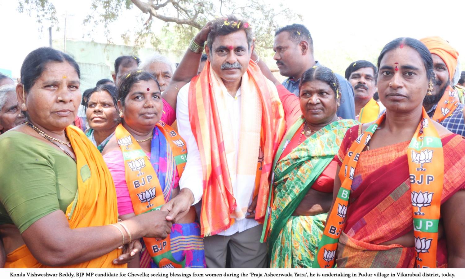 Hyderabad: Konda Vishweshwar Reddy, BJP candidate for Chevella Parliamentary constituency, speaking on the second day of the Praja Asirwada Yatra, he is undertaking in the Chevella constituency, said, I am here to seek the blessings of the people, hear your problems and address them. In this crucial election, the choice rests between Narendra Modi and Rahul Gandhi. You should cast your vote in favour of the Lotus symbol, to ensure continuation of the commendable work Modi has spearheaded over the past decade.