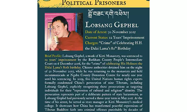In a post on X, the CTA shared details under its "Profiling Tibetan Political Prisoners" campaign. It stated that Lobsang Gephel, a monk of Kirti Monastery, was detained by Chinese authorities on the night of November 30, 2015, while returning to the monastery. He was held incommunicado at Ngaba County Detention Centre for nearly a year before being sentenced by the Barkham County People's Intermediate Court on December 6, 2016.The CTA stressed that Lobsang's case illustrates China's criminalisation of peaceful expressions of Tibetan Buddhist faith. His prosecution drew international condemnation in 2019, when five United Nations human rights experts denounced China's persecution of nine Tibetans, including Lobsang Gephel, explicitly recognising these cases as targeting individuals for their "expression of cultural and religious identity."