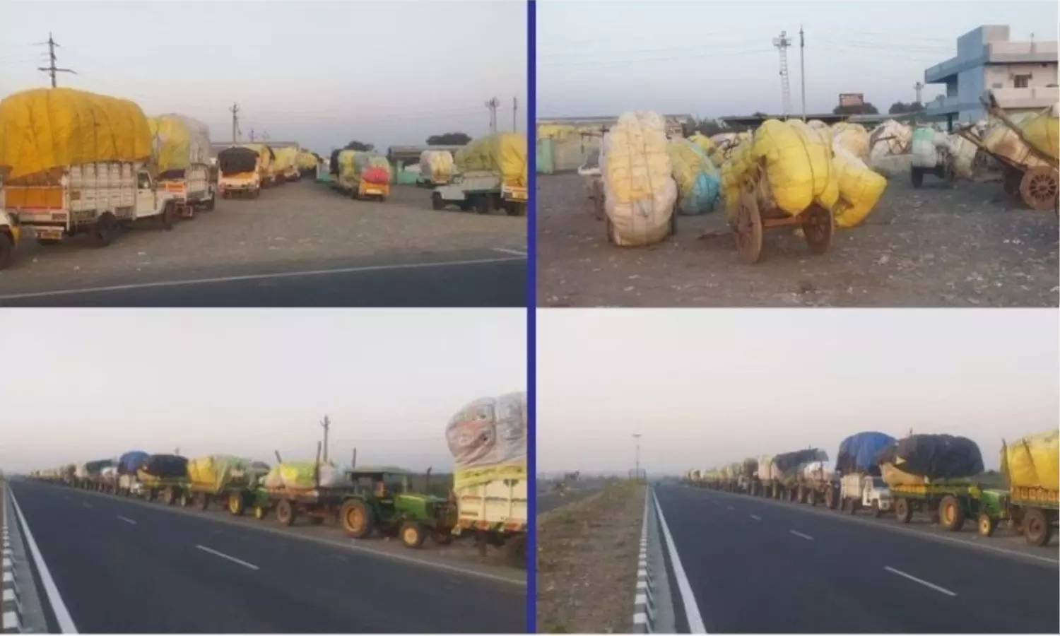 The delay in purchase of cotton by the CCI caused losses to farmers who can't take back the produce. Long queues of vehicles loaded with cotton were stranded on the roads leading to the market yard in Adilabad market yard.