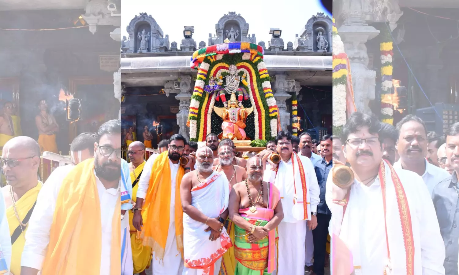 Temple priests led the ceremonial procession, with the deity Sri Lakshmi Narasimha Swamy adorned as Sri Maha Vishnu and paraded on Garuda Vahana through the Mada Veedulu (temple streets).