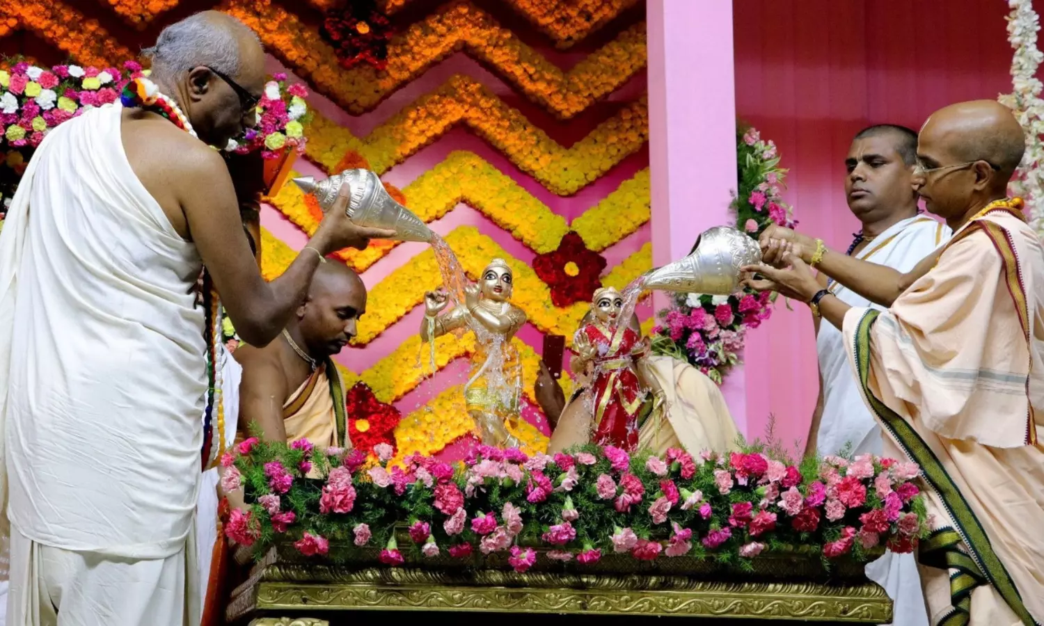 Gods Radha Govinda were bathed with Panchamrita, Panchagavya, fruit juices, herbal powders, flowers, and special Aushadhis. The holy water from the seven sacred rivers of India was also used in the Abhishekam. After the ceremony, the holy water was sprinkled on the devotees as part of Maha Samprokshana. Madhu Pandit Dasa Prabhu, chairman of Ikcon Bengaluru and Akshaya Patra, speaking on the occasion, encouraged everyone to chant the Hare Krishna Maha Mantra daily.