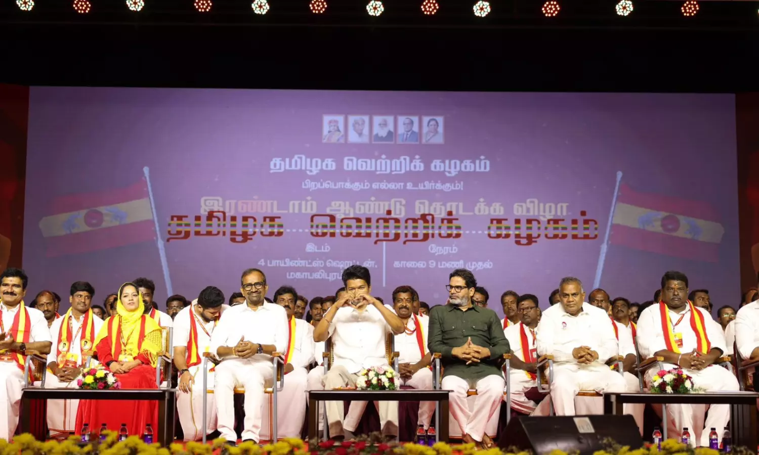 TVK anniversary in Mahabalipuram sees media access issues, bouncers at venue, and shifting political event culture in Tamil Nadu.