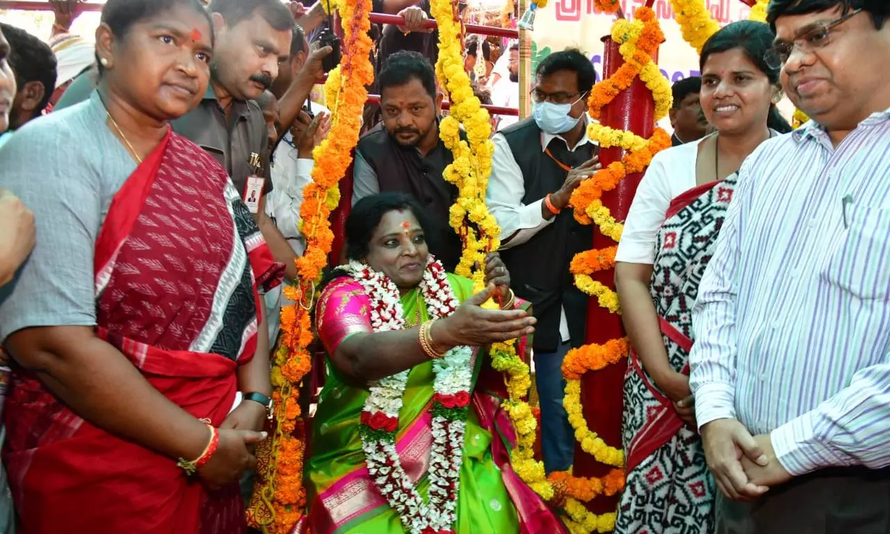 Warangal: Telangana state Governor Tamilisai Soundararajan offered jiggery (bangarama) equal to her weight and presented silk saris to the presiding deities Samakka and Saralamma, at the jatara in Mulugu district on Friday.