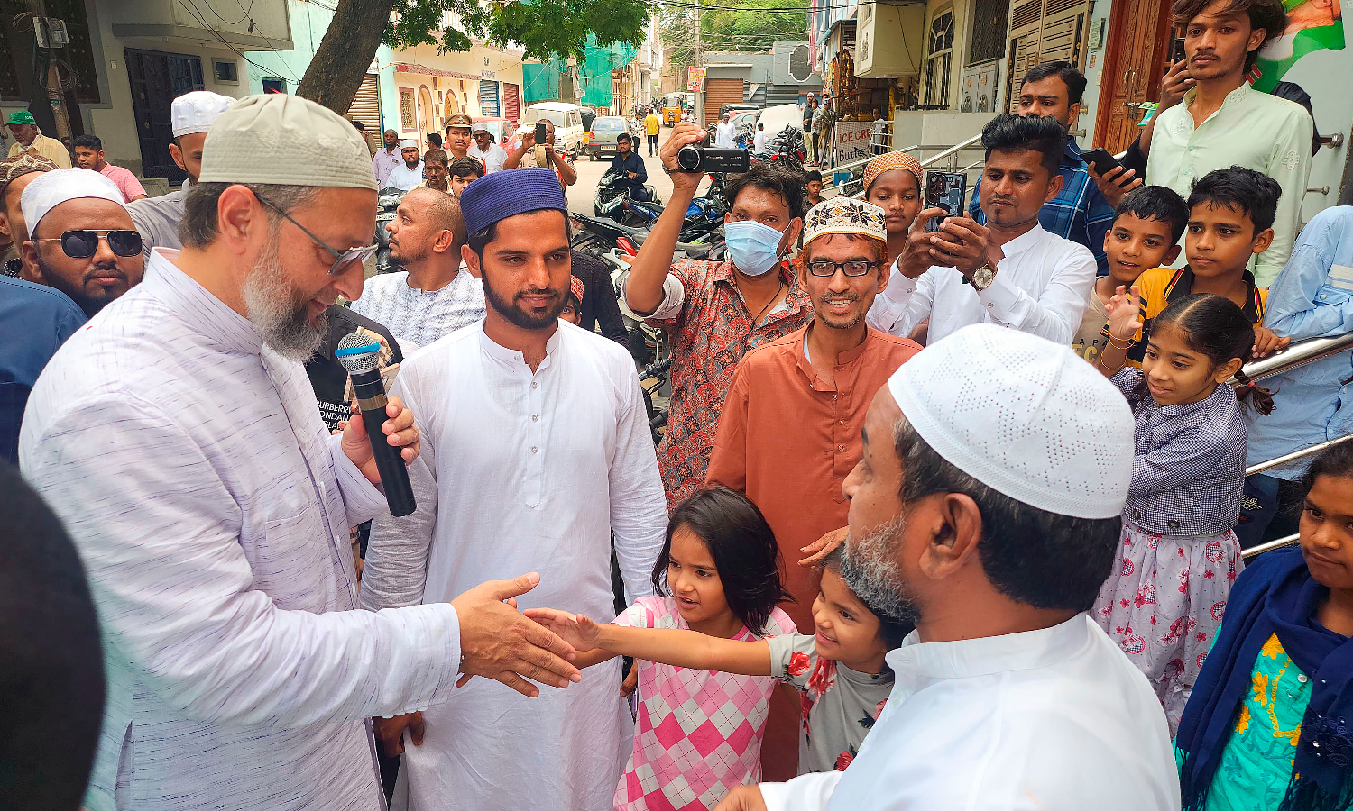 Accompanied by a large number of supporters, including party legislators and corporators, Owaisi, with a microphone in his hand, conducted door-to-door canvassing in Kamatipura, Osmanbagh and Bandlaguda of the Bahadurpura Assembly segment.