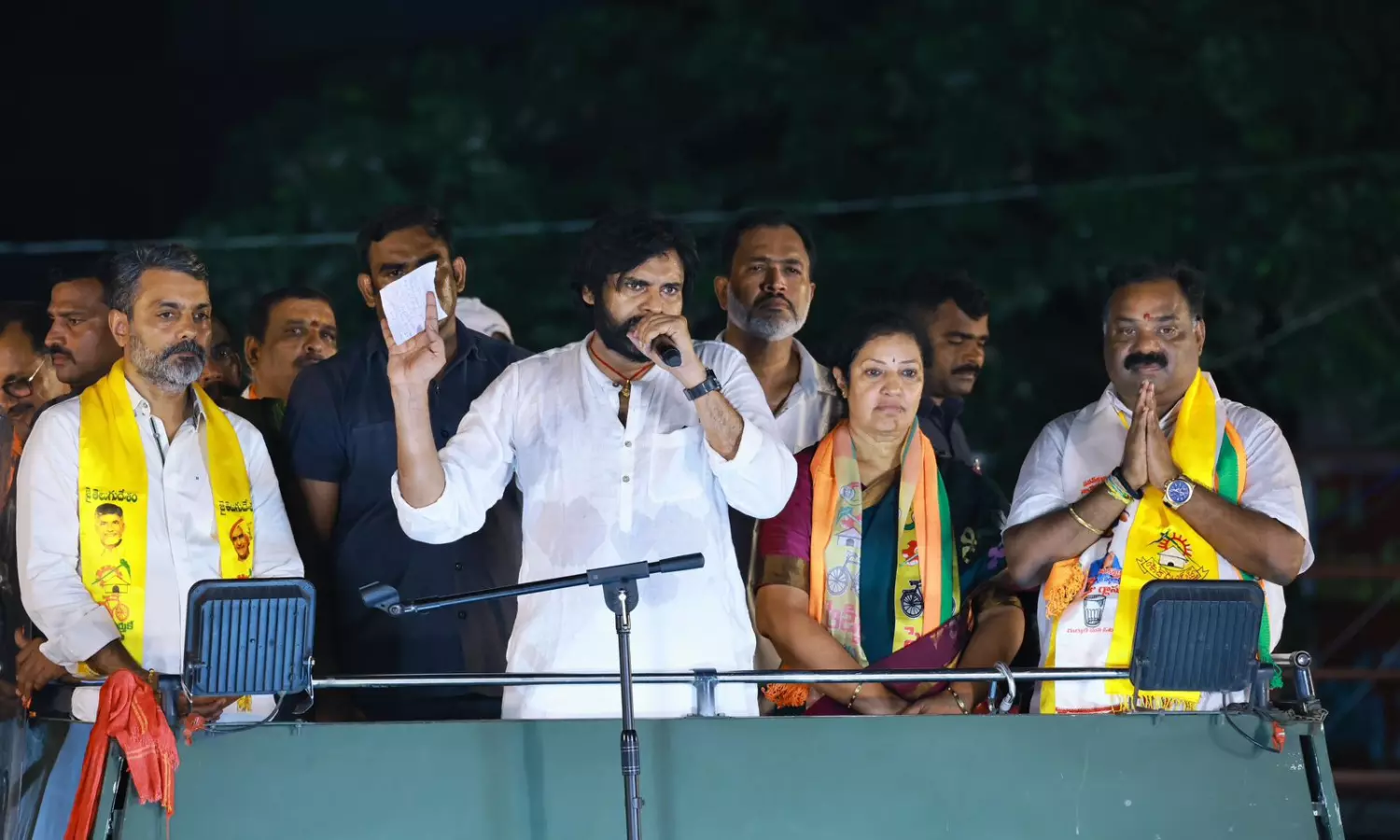 Addressing a public meeting on Saturday from atop his Varahi vehicle along with BJP state president Daggubati Purandeswari and others at Korukonda within the Rajamahendravram Assembly constituency, the JS chief targeted the YSRC MLA from Rajanagaram Assembly segment Jakkampudi Raja alleging that Raja resorted to a series of illegal activities, like mining of sand, trading in ganja, maintaining blade batches, developing layouts in nearly 150 acres land and purchase of 600 acres land at cheap price and selling it at exhorting price.