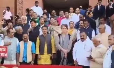 Later, Congress general secretary Priyanka Gandhi Vadra, along with other Congress MPs, including those who have been recently suspended, stood on the steps of Makar Dwar and protested against the government over the deal.
