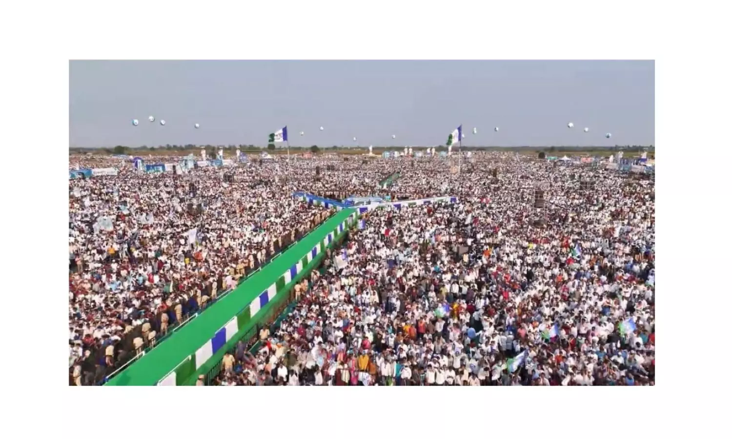 At the Bapatla meet, the ramp was shaped in the form of ‘Y’ with Jagan’s war cry ‘Why Not 175?’ highlighted at the Centre and the party flag flying high at the end of both arms of ‘Y’.