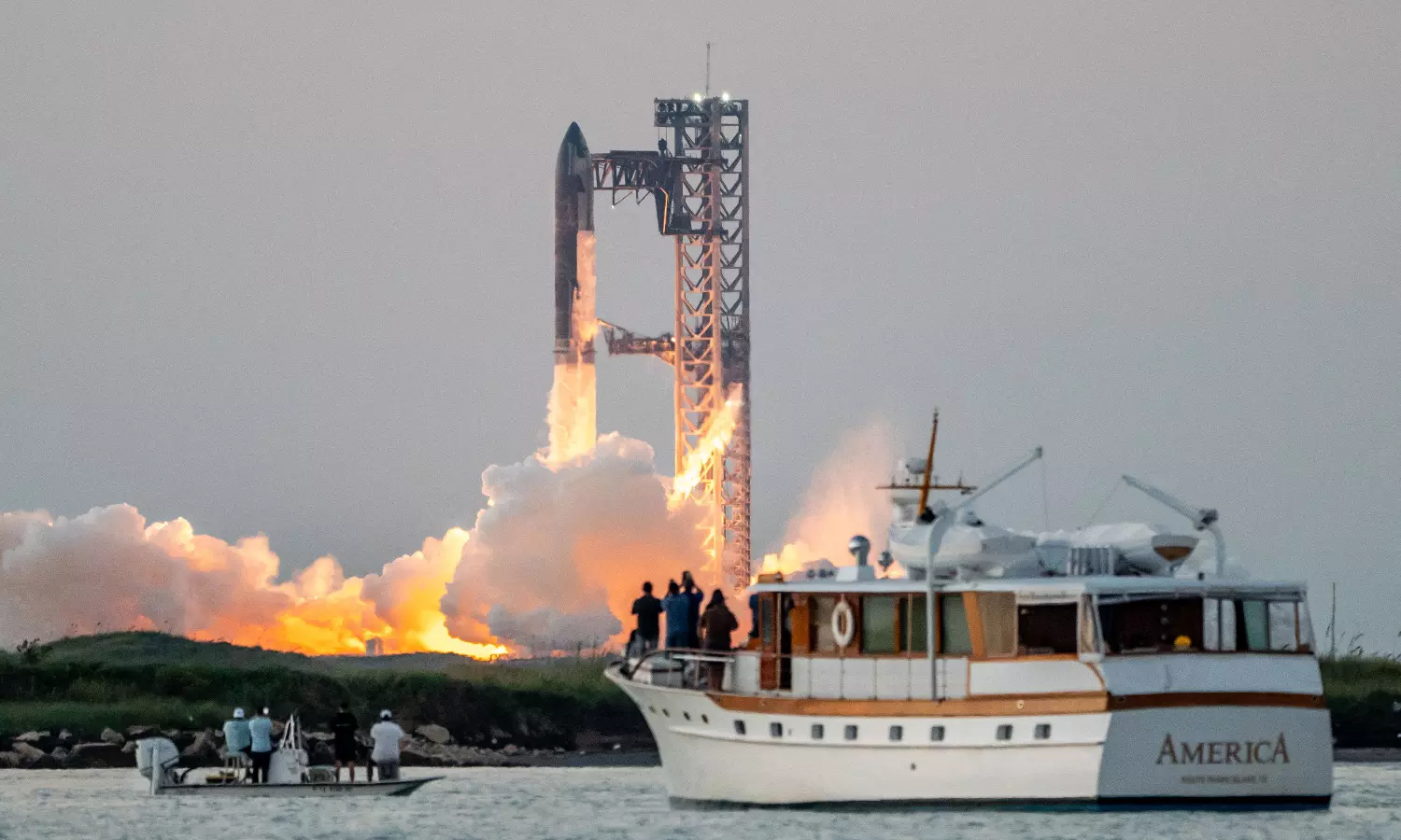 The SpaceX Starship lifts off from Starbase near Boca Chica, Texas, on October 13, 2024, for the Starship Flight 5 test. SpaceX successfully "caught" the first-stage booster of its Starship megarocket Sunday as it returned to the launch pad after a test flight, a world first in the company's quest for rapid reusability. (Photo by SERGIO FLORES / AFP)
