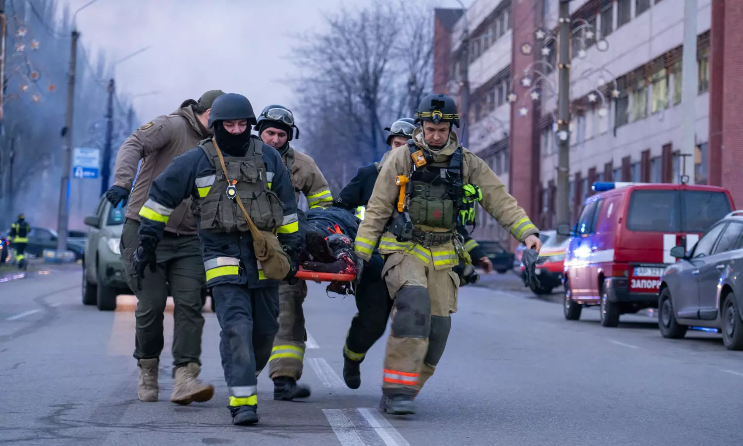Footage posted on Ukrainian President Volodymyr Zelenskyy’s Telegram channel shows civilians lying in a city street littered with debris. The post shows them being treated by emergency services and taken away on gurneys.