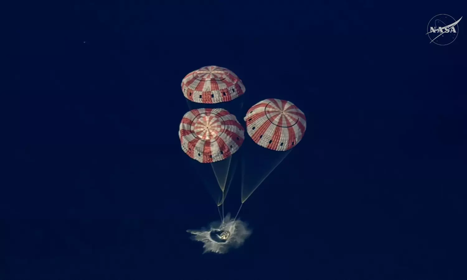 Like so many others, lead flight director Jeff Radigan anticipated feeling some of that “irrational fear that is human nature,” especially during the six-minute blackout that preceded the opening of the parachutes. The recovery ship USS John P. Murtha awaited the crew’s arrival off the San Diego coast, along with a squadron of military planes and helicopters.
