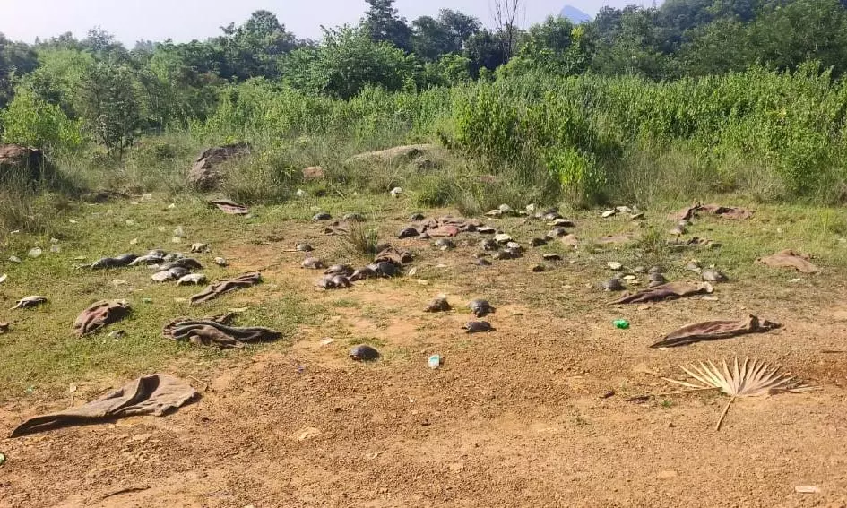Caption: In an incident of wildlife poaching, the Folkspeta forest division officials discovered 64 deceased turtles.