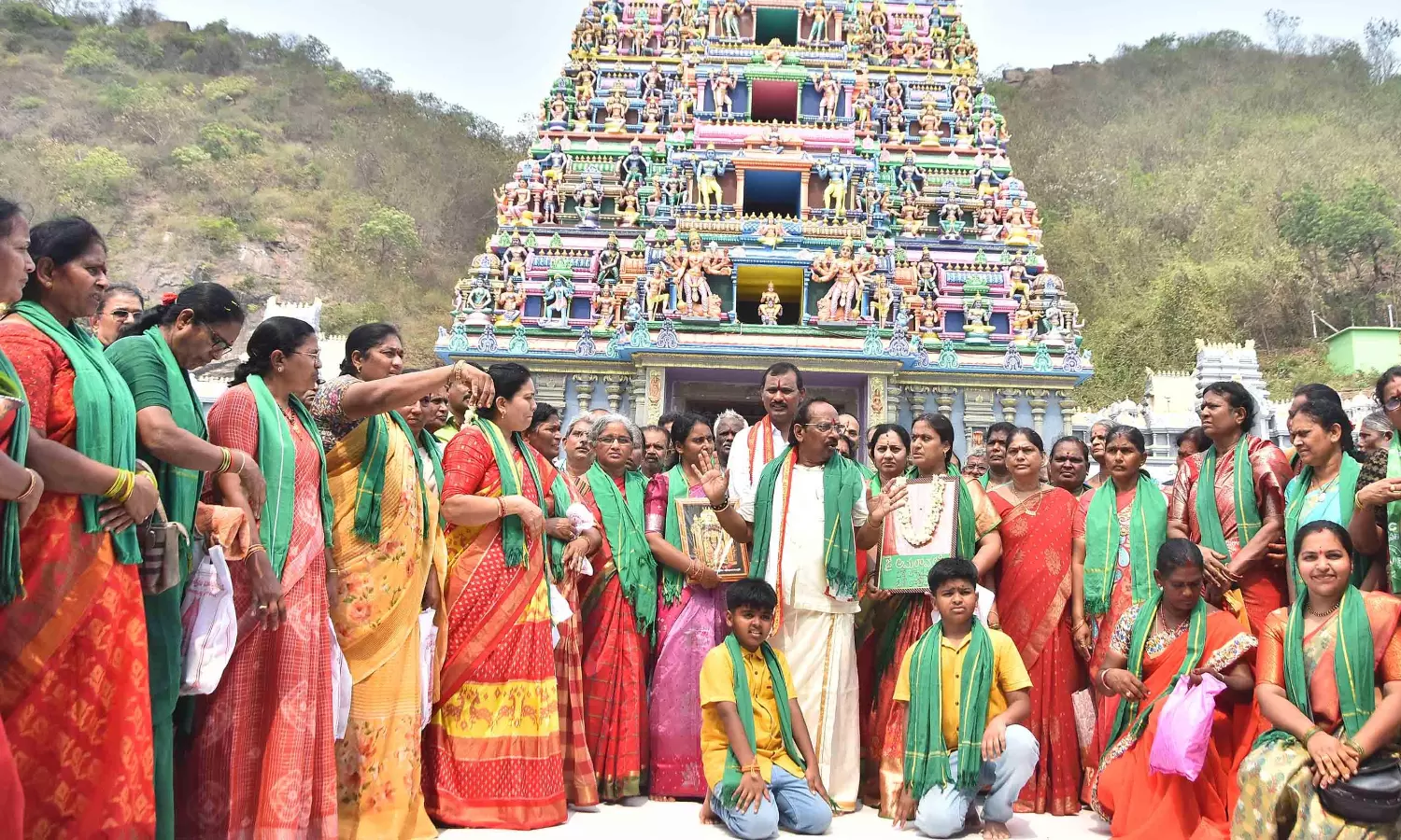 Vijayawada: Several farmers and women staged a march on foot (padayatra) from the villages in Amaravati to the Kanaka Durga temple atop Indrakeeladri here on Monday and fulfilled their vows and offered special prayers to the deity and also offered ‘sare’ to the deity as the Parliament passed the bill unanimously to give statutory status to Amaravati as the capital city of Andhra Pradesh.