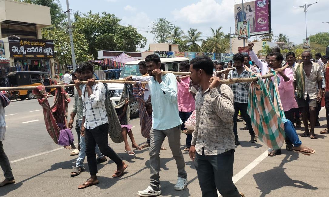 Visakhapatnam: Tribal people from 15 villages took out a doli yatra from Abir Centre to the Narsipatnam revenue divisional officer (RDO) office in Anakapalle, demanding basic amenities such as improved road access, a reliable water supply, better schools and the protection of their tribal lands.