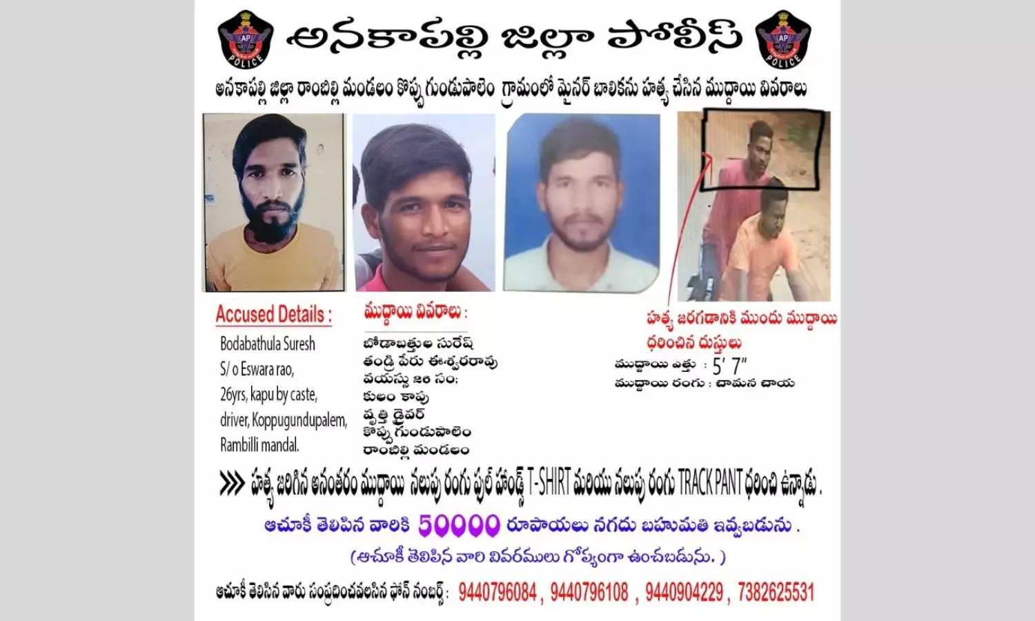 Visakhapatnam: The Anakapalli police have announced a reward of Rs 50,000 for assistance in the arrest of Suresh, the accused in the murder of a minor girl in Koppu Gundu Palem village on Saturday.
