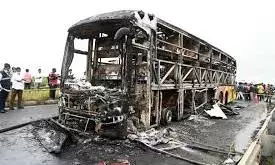 As many as 19 passengers travelling in the private bus and a motor bike rider were charred to death after it collided with the two-wheeler at Chinnatekuru village of Kurnool district.