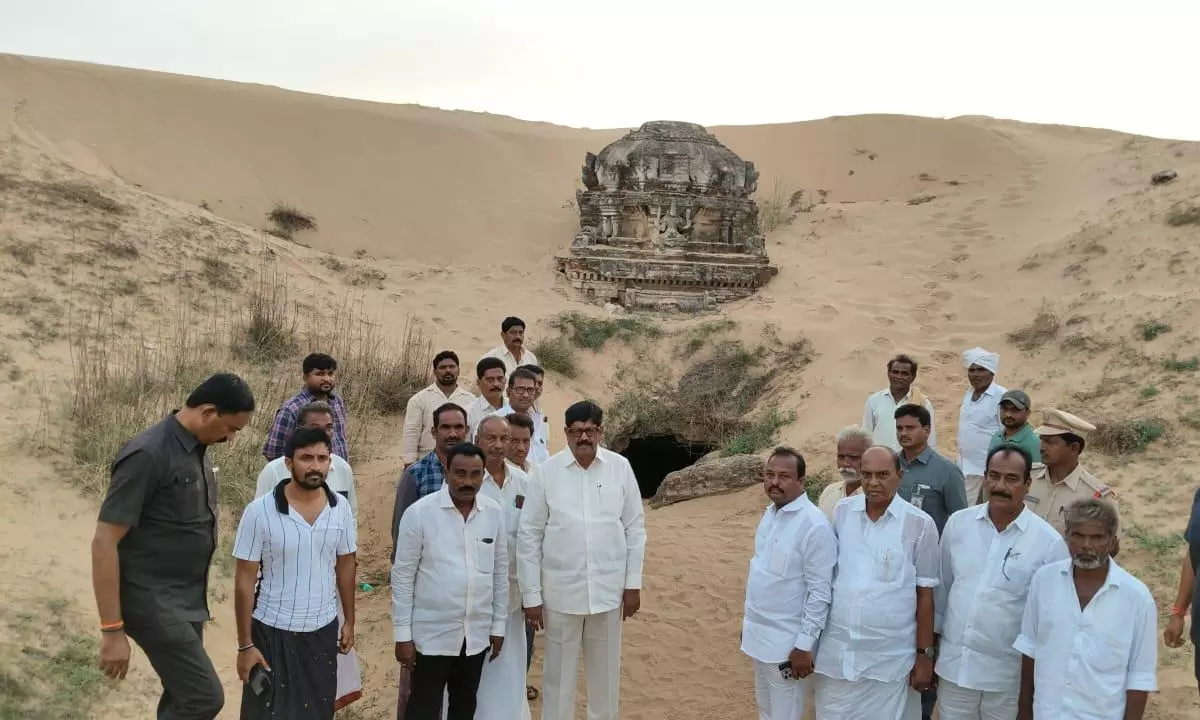 Nellore: A centuries-old Shaivite shrine—Nagalingeswara Swamy Temple—has been unearthed near Perumallapadu village in Chejerla mandal on the banks of the Penna River. The temple, buried under sand mounds for decades, has begun resurfacing due to natural changes and local efforts since 2020.
