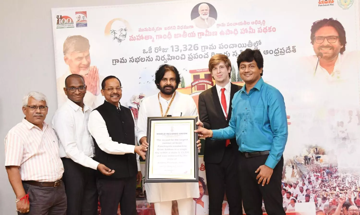 Panchayat raj principal secretary Shashi Bhushan Kumar, department director Krishna Teja, NREGA director Shanmukh and NREGA joint commissioner Siva Prasad were present when Deputy CM Pawan Kalyan received the global award from the World Records Union.