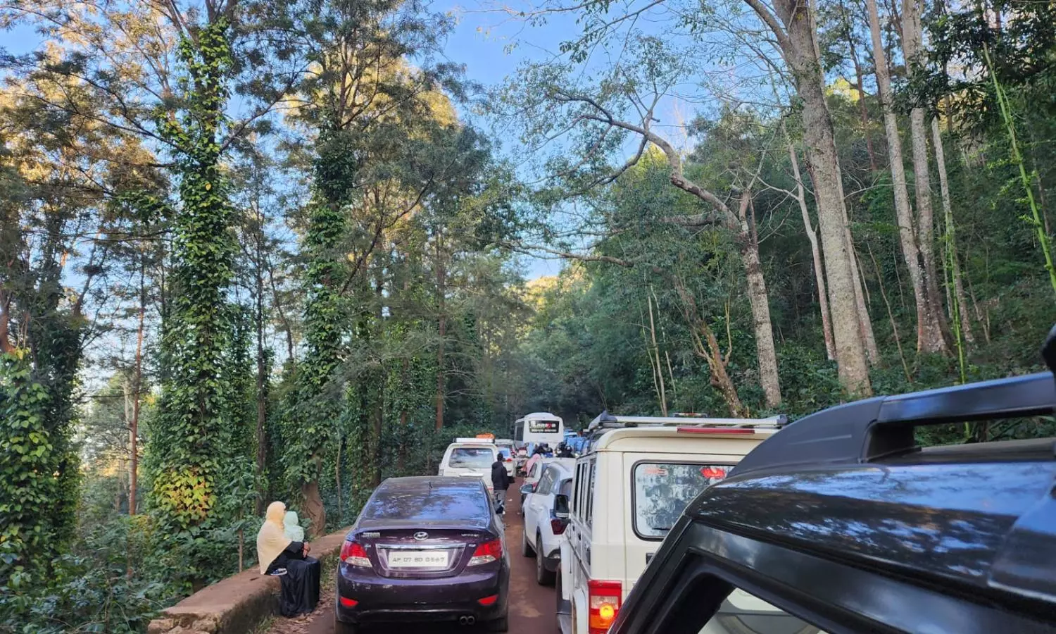 Tourists thronged the area for local attractions like bamboo chicken and coffee, with large buses adding to the bottleneck. The narrow ghat road struggled to accommodate the heavy traffic, causing a 45-minute delay to cover just 500 metres. The return journey was worse, with an hour-long jam.