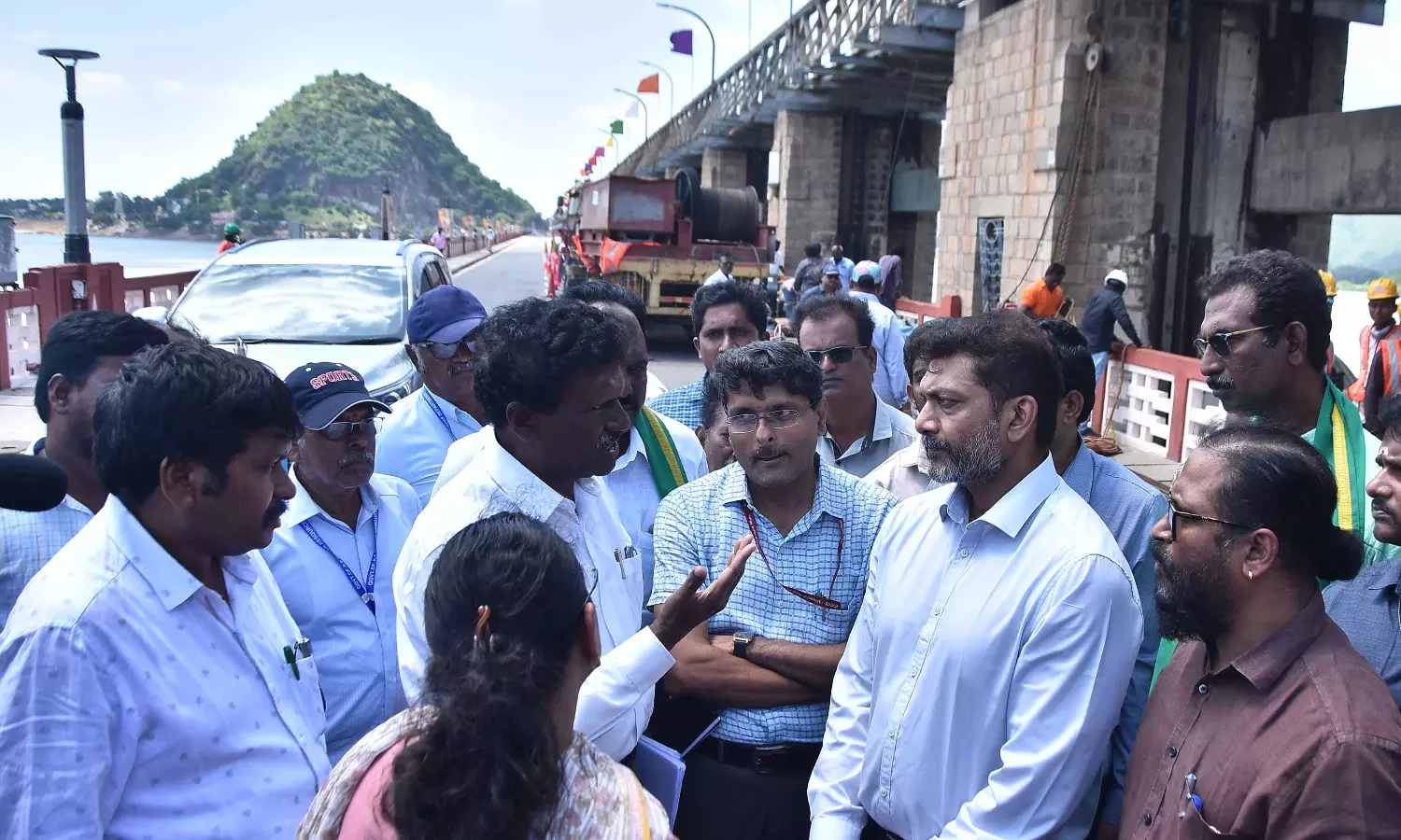 Special officer M Venkateswara Rao and district collector Srijana explained to the team about the flood conditions affecting Prakasam Barrage.