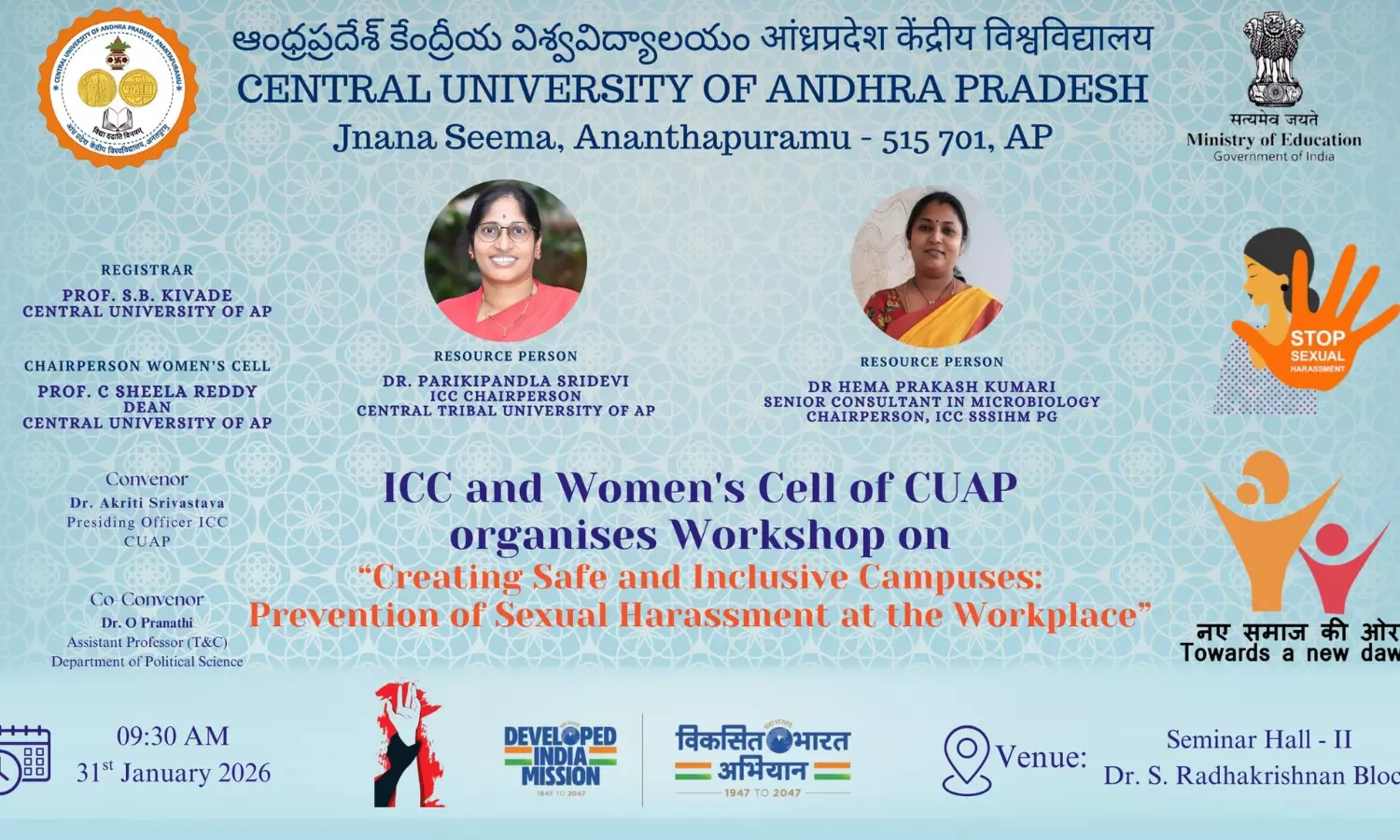 Anantapur: The Women’s Cell and Internal Complaints Committee (ICC) of the Central University of Andhra Pradesh (CUAP) organised a one-day awareness workshop on the prevention of sexual harassment at the workplace at ‘Jnana Seema’ in Janthuluru, Anantapur, on Saturday.