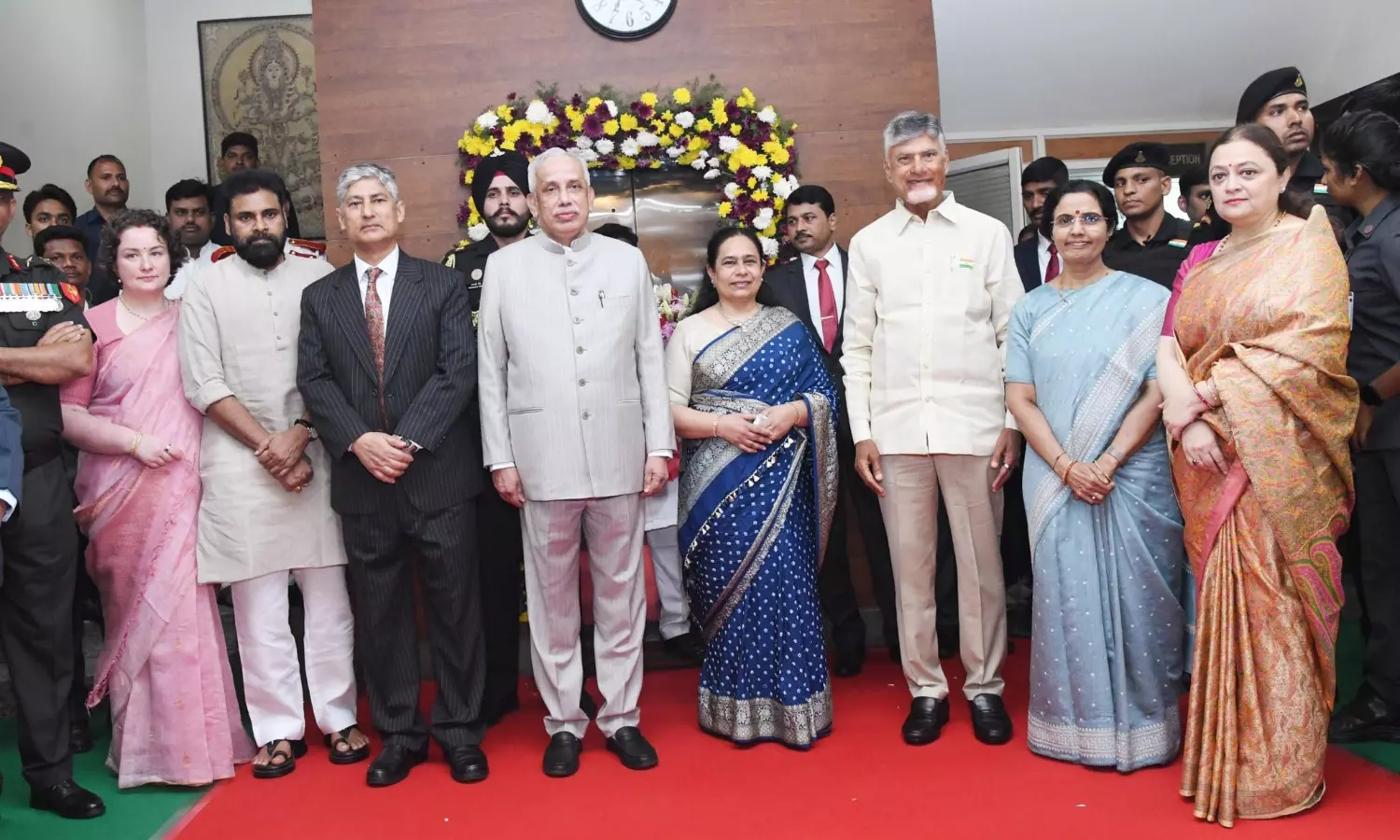 Chief minister N Chandrababu Naidu along with his wife N Bhuvaneswari, high court chief justice Justice Dhiraj Singh Thakur and his wife Gudiya Thakur, deputy chief minister Pawan Kalyan and his wife Anna Lezhneva graced the event.
