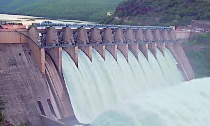 At the Jurala project, inflows stand at 1,23,008 cusecs, and 1,24,617 cusecs are being released downstream. The Sunkesula barrage is discharging nominal outflows of 9,155 cusecs into the river. Meanwhile, 30,944 cusecs are being released through the AP Powerhouse and 35,315 cusecs through the Telangana Powerhouse. Of the six spillway gates at Srisailam, four have been closed, and officials are releasing 55,600 cusecs through the remaining two gates as of Wednesday.