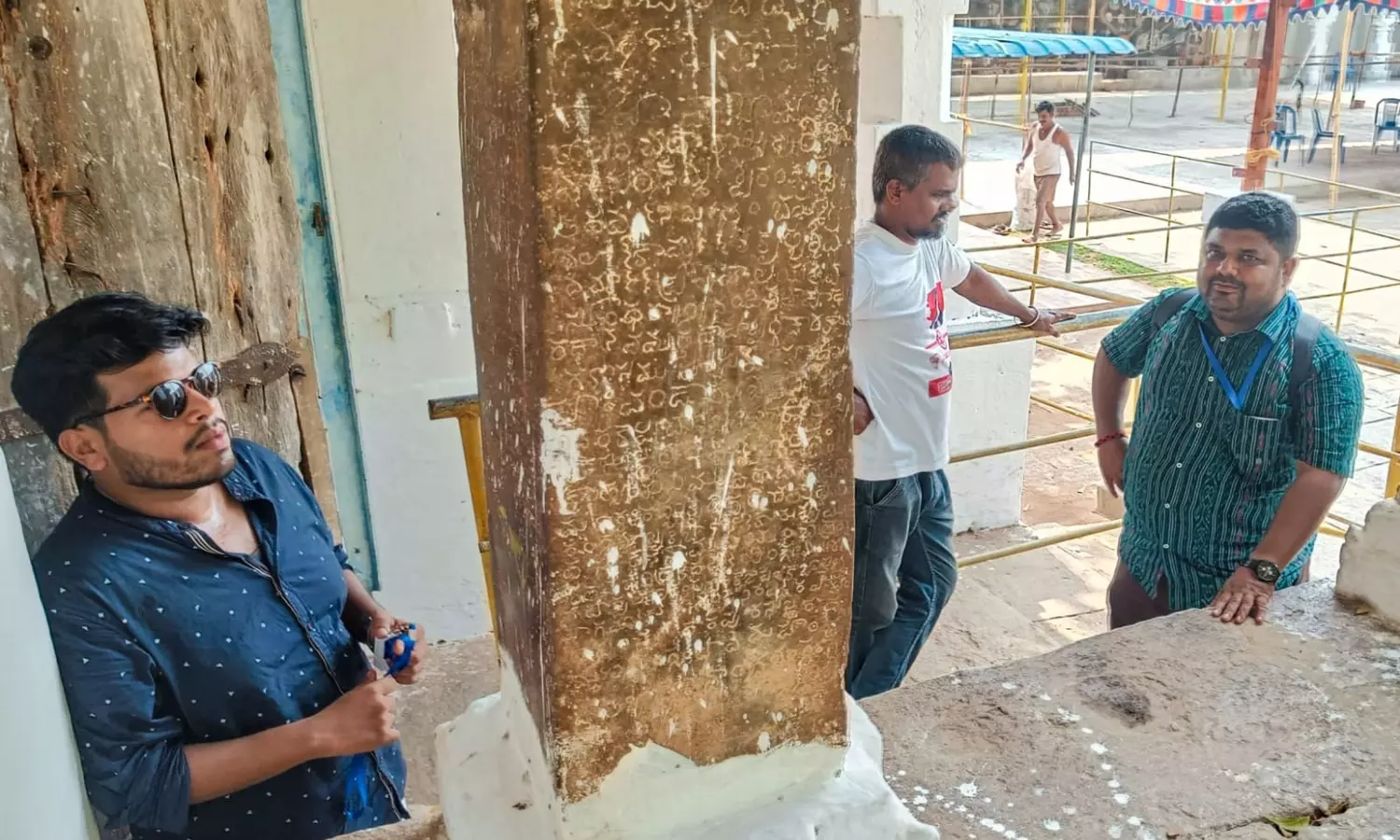 Deepak Kumar Nayak said the inscription is engraved on three faces of a square black stone panel pillar at the eastern entrance of the temple. The inscription is from the time of Choda III, a king of the Haihaya dynasty. Inscribed in Telugu script and Sanskrit, it is dated to Saka Samvata 1325 that equals the year 1403 CE. The inscription runs into 93 lines.