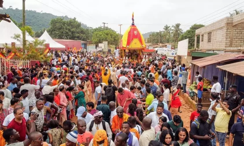Along with devotees from several foreign countries, the Rath procession began from D-Address Mall on Bandar Road. It proceeded through PVP Mall, Siddhartha Public School, Poly Clinic Road, Guru Nanak Colony, Fun Time Road, RTC Colony, Panta Kaluva Road, Krishnaveni Road, Krishnalanka and Ramalingeshwar Nagar Nandu, before culminating at the Gundicha Mandir of ISKCON near the Screw Bridge.