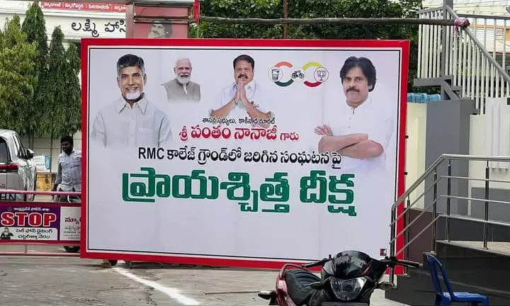 Kakinada: Taking responsibility for his actions, Kakinada Rural MLA Pantham Venkateswara Rao (Nanaji) observed Prayaschitta Deeksha (atonement) at his residence from 10 am to 4 pm on Monday. The Jana Sena MLA had abused a professor of Rangaraya Medical College on Saturday.