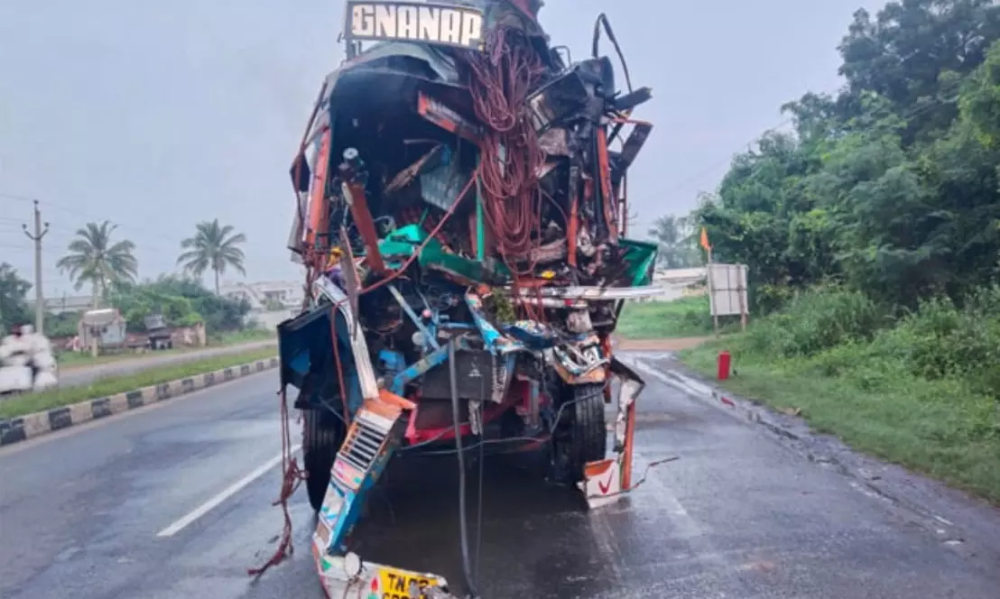 A person was grievously injured in the incident. According to the police, containers laden with explosives that belonged to the Army were parked at a fuel station. A rice-laden lorry collided with the parked container from behind, triggering a fire. The driver was trapped in the cabin. Locals used buckets of water to help douse the fire. After receiving information, fire tenders arrived at the scene and brought the fire under control. It took more than an hour to rescue the trapped driver from the cabin. The driver was then transported to Ongole for treatment. A case has been registered.