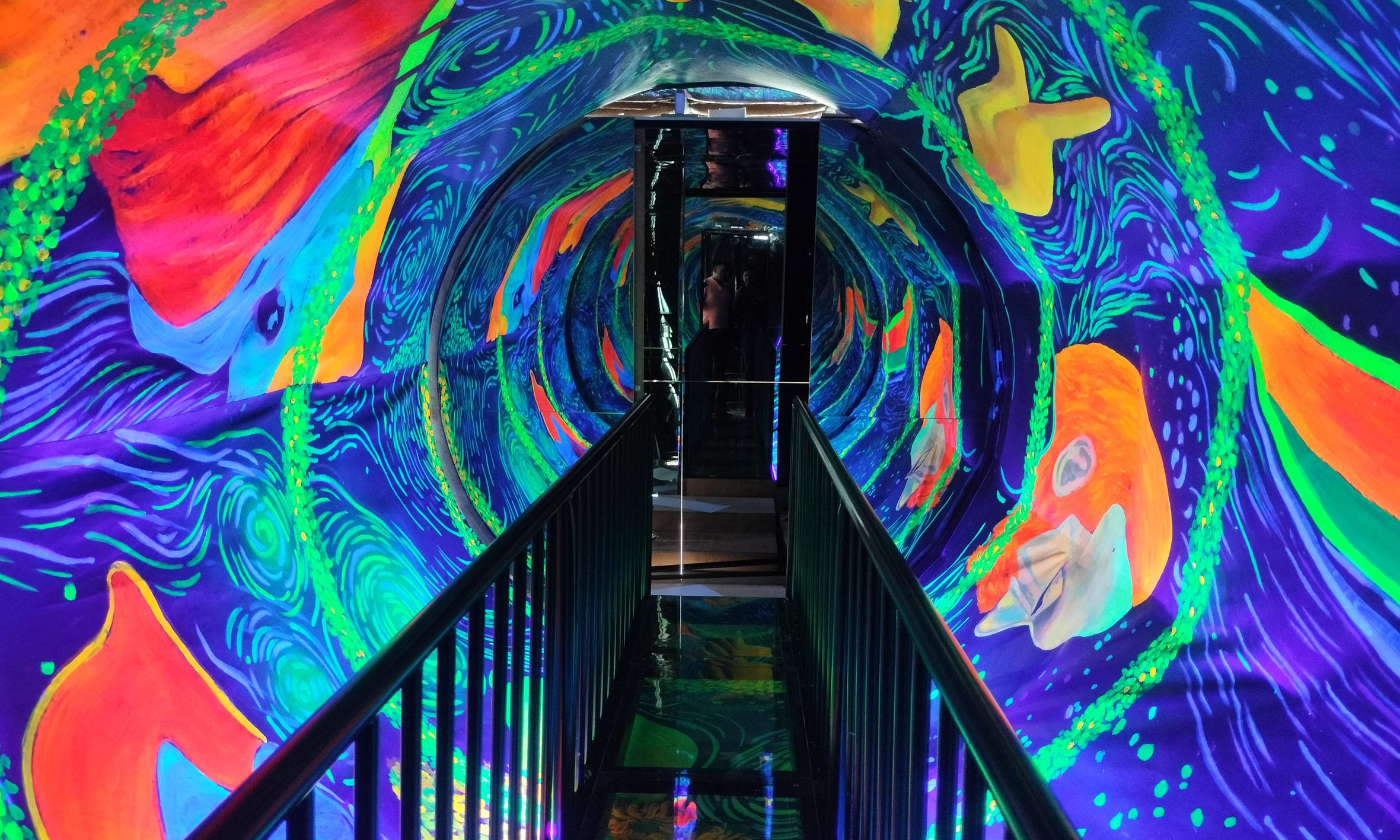 Other attractions include the Kaleidoscope Room with shifting geometric patterns, the Dizzy Tunnel that tests balance, the Avatar Tree Room inspired by luminescent flora, the Mirror Maze of endless reflections, and the Rainbow Column Room filled with radiant light pillars.